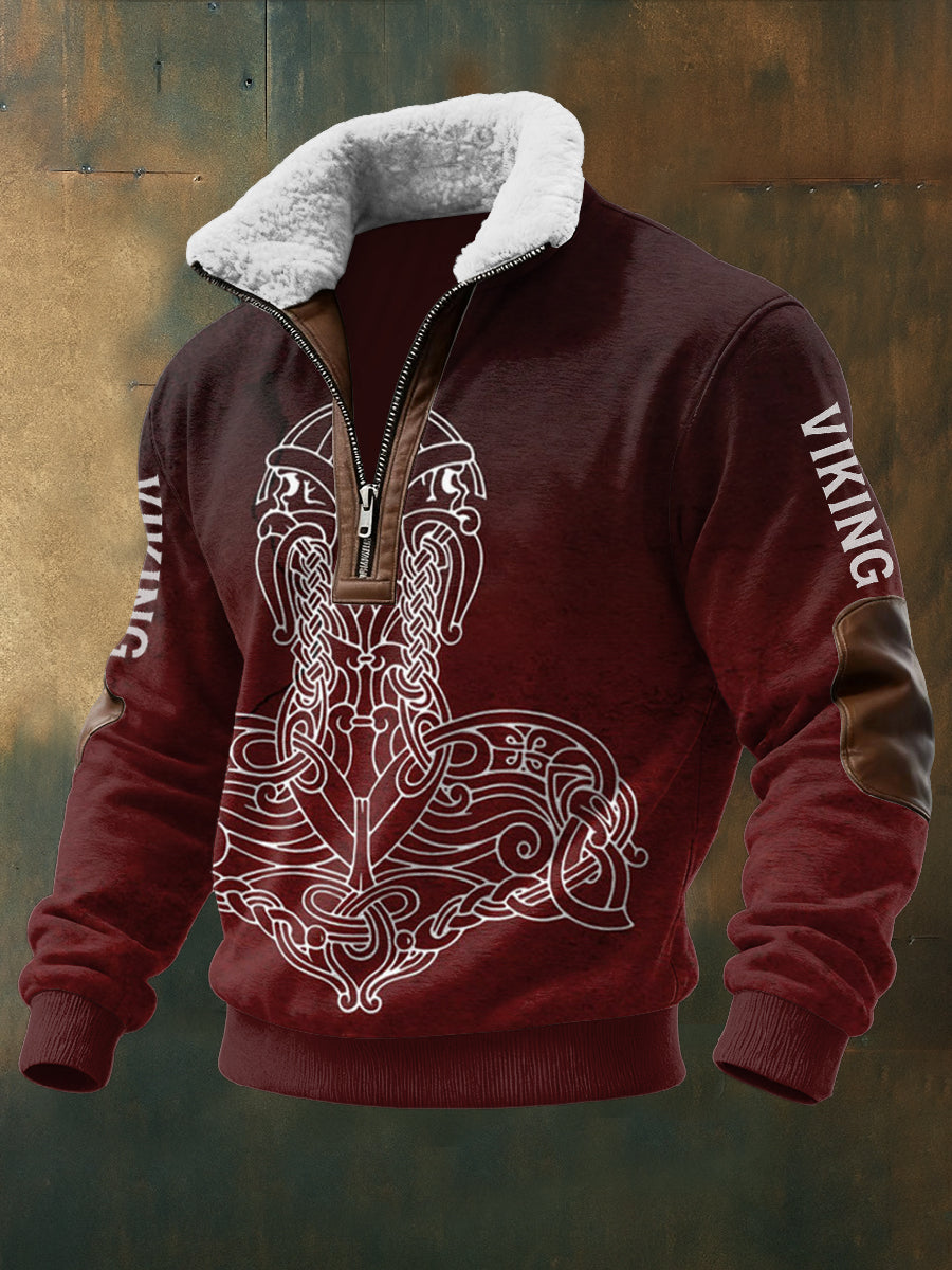 Férfi viking nyomtatott hosszú ujjú állni gallér bárányhaj cipzár felső