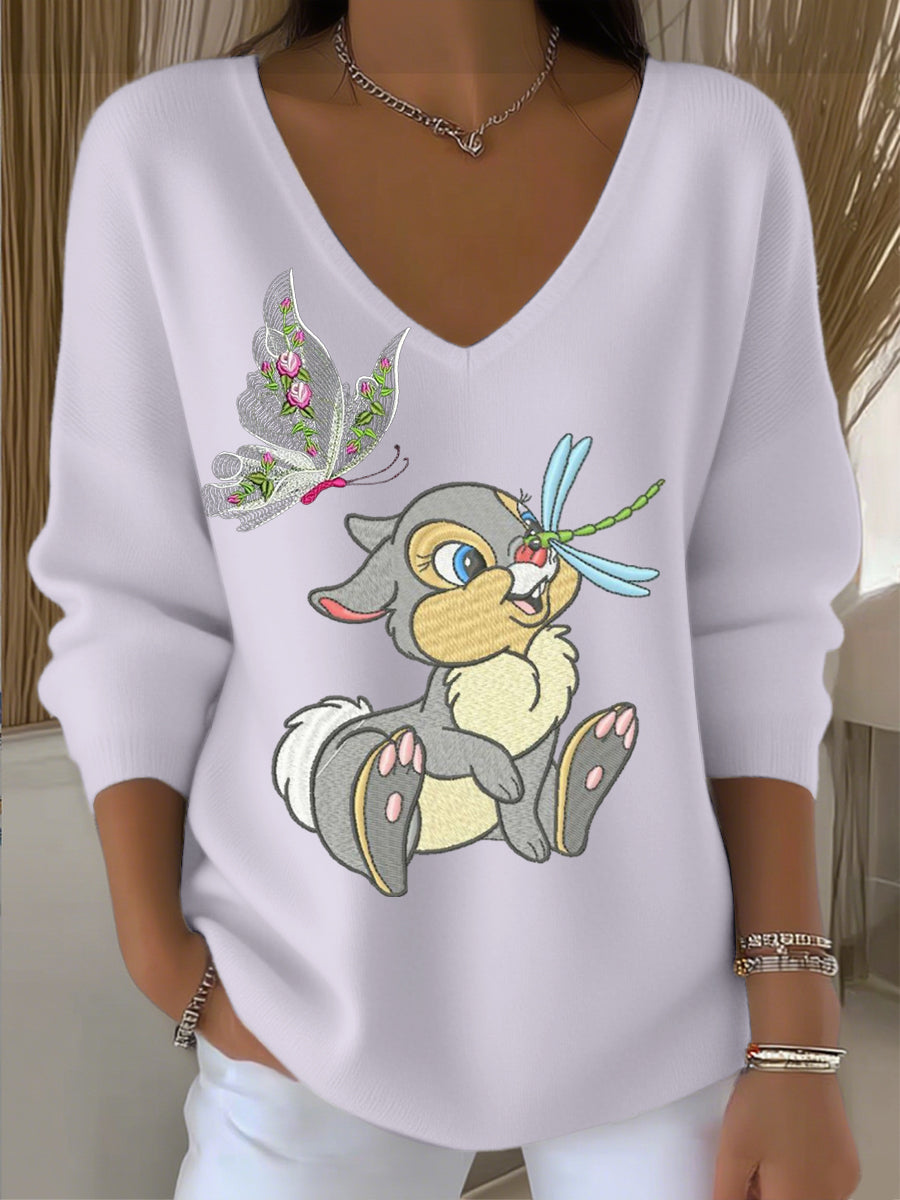 Női aranyos nyúl és pillangó hímzett világos lila v-nyak pulóver