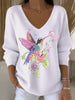 Női egyszerű és elegáns világos lila virágos és kolibri hímzett v-nyak pulóver