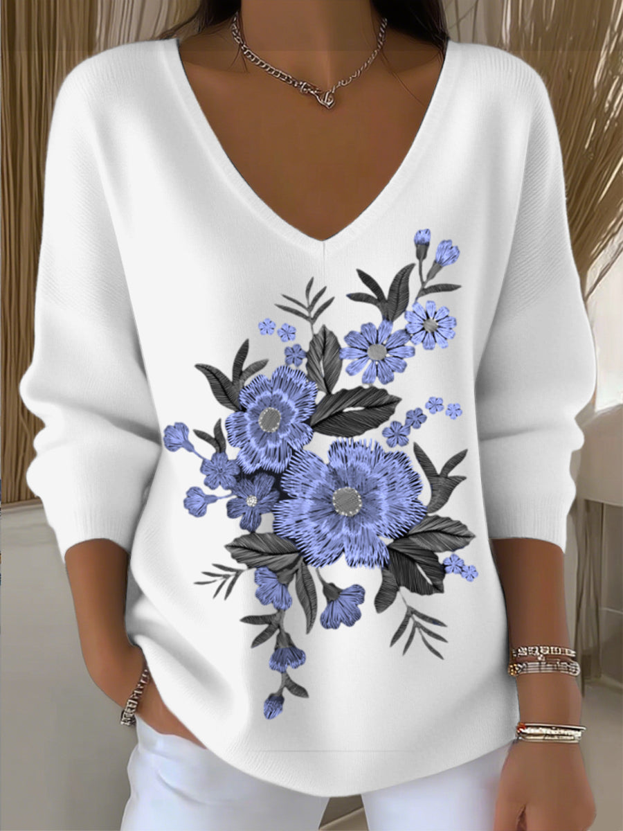 Női európai stílusú fehér v-nyak pulóver, párosított bájos virágos hímzés, divatos és kényelmes, megfelel a napi viselési igényeknek