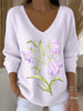 Női európai stílusú világos lila v-nyak pulóver gyönyörű virágos hímzéssel, divatos és kényelmes, napi viseletre alkalmas