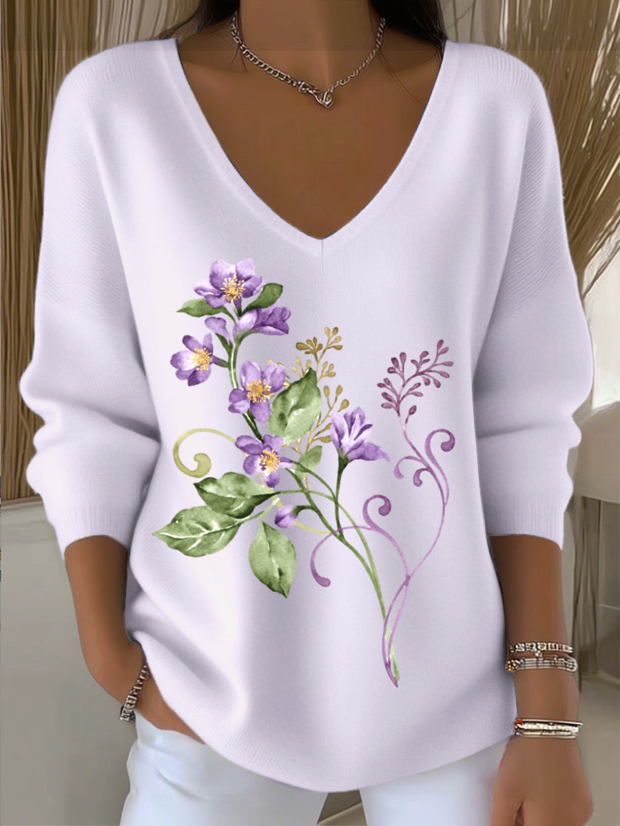 Női európai stílusú világos lila v-nyak pulóver káprázatos virágos hímzéssel, divatos és puha, megteremtve a napi divat érzését