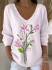 Női európai stílusú világos rózsaszín v-nyak pulóver bájos virágos hímzéssel, divatos és könnyen viselhető, könnyedén napi megjelenés létrehozása