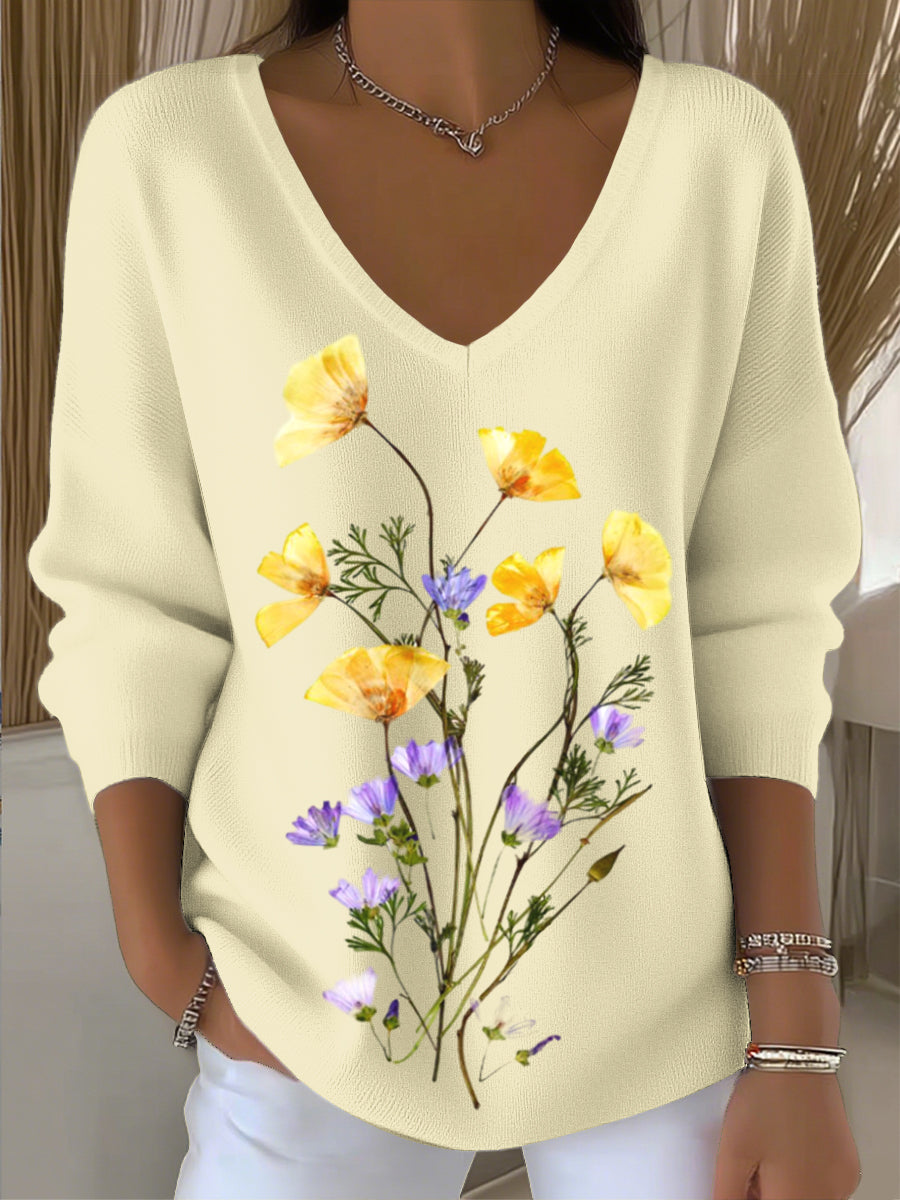 Női európai stílusú világos sárga v-nyak pulóver lenyűgöző virágos hímzéssel, tiszta és könnyen viselhető, alkalmas a különböző napi stílusok