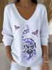 Női európai stílusú világoskék v-nyak pulóver, díszített elbűvölő páva hímzés, tiszta és szoros illeszkedés, ami egy napi finom érzés