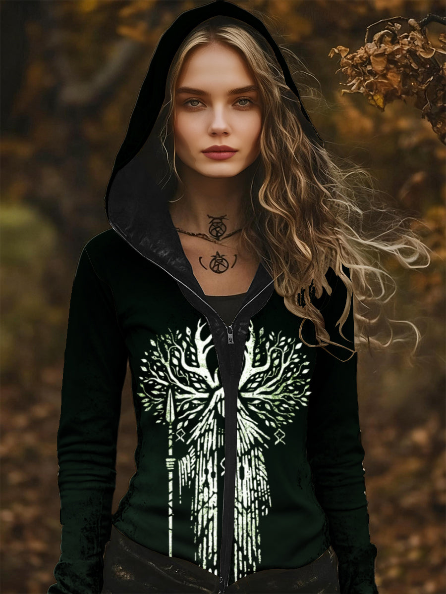 Női izzó yggdrasil fa nyomtatás zip-up kapucnis