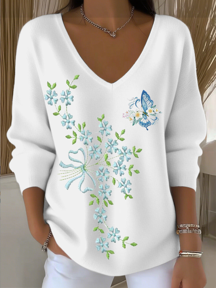 Női kék virág és pillangó hímzett v-nyak pulóver