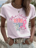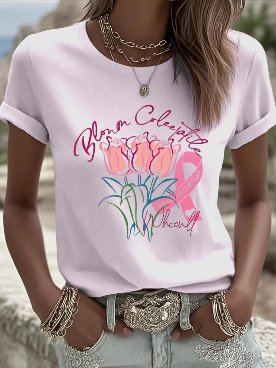 Női rózsa és szalag nyomtatott világos rózsaszín kerek nyak rövid ujjú