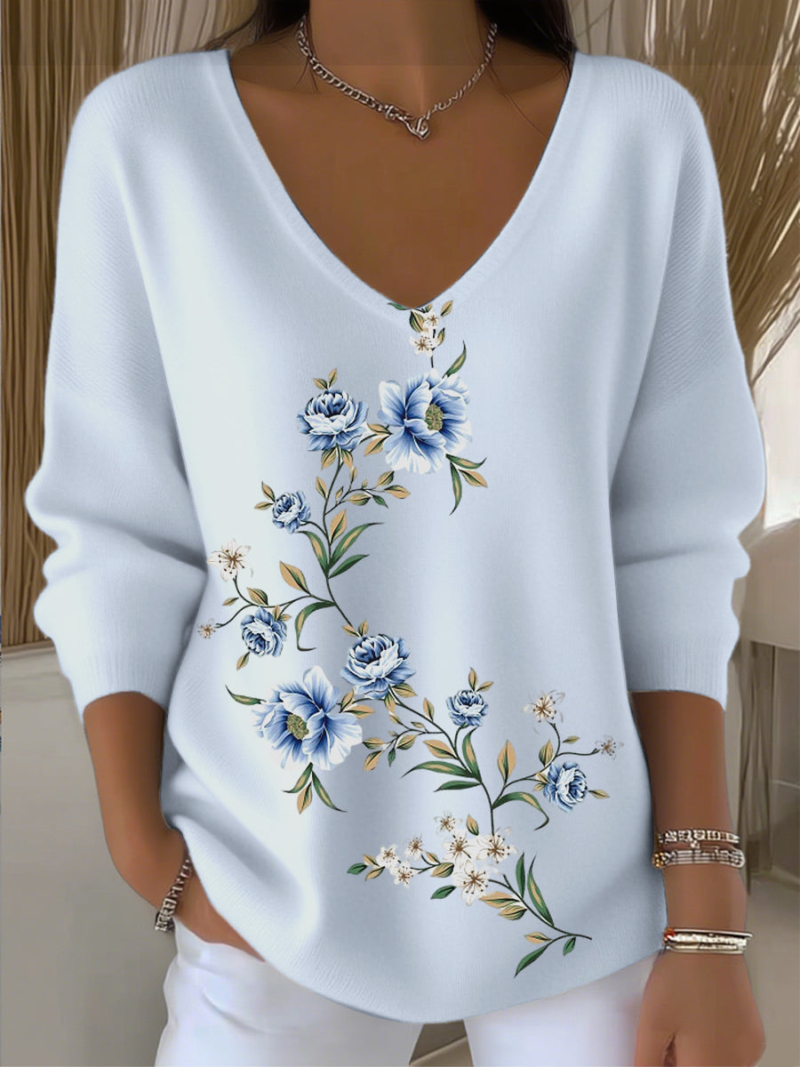 Női temperamentum virágos hímzés kék v-nyak pulóver