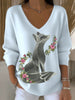 Női világos kék aranyos róka hímzett v-nyak pulóver