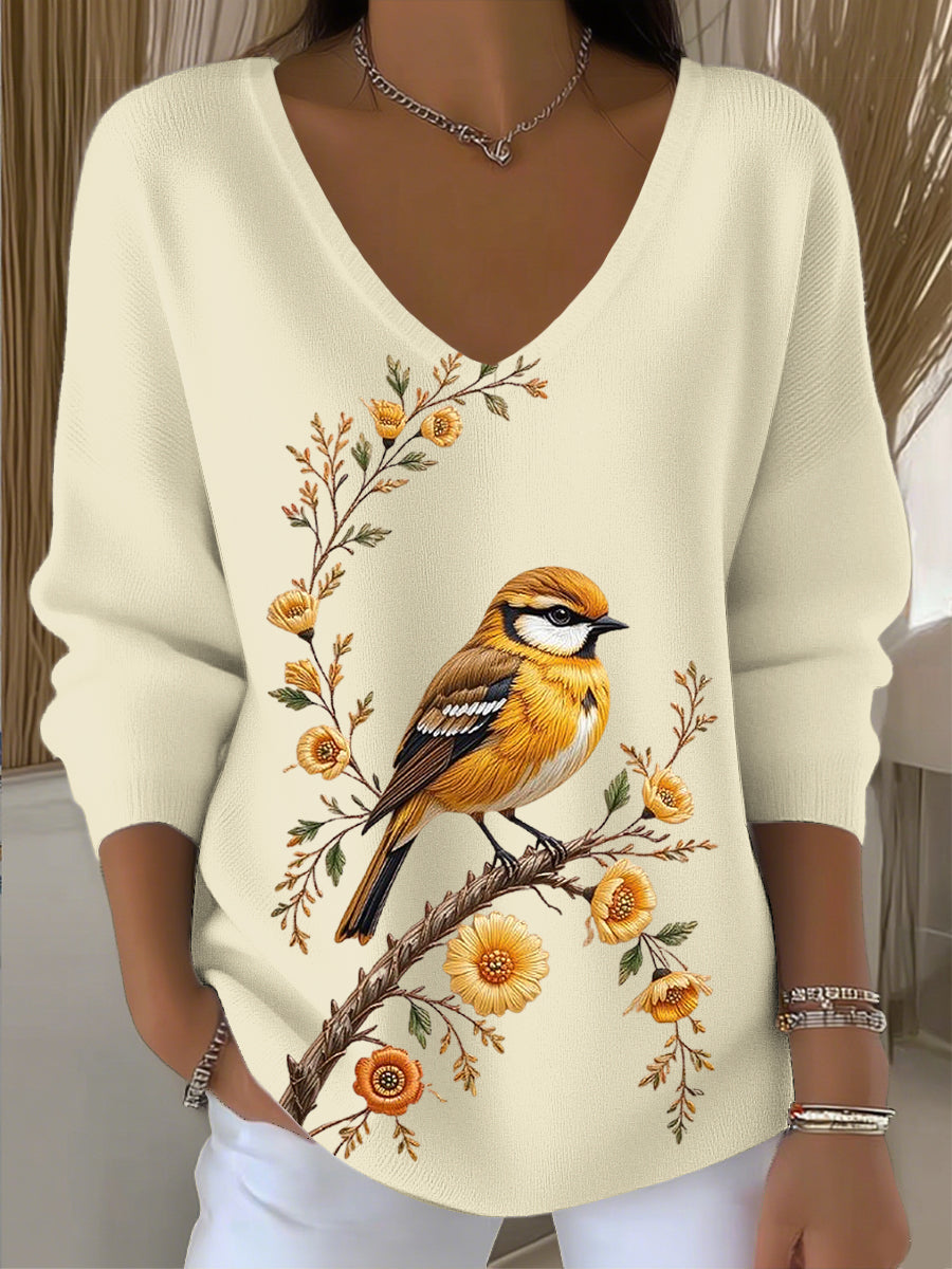 Női vintage madár és virágos művészet v-nyak felső