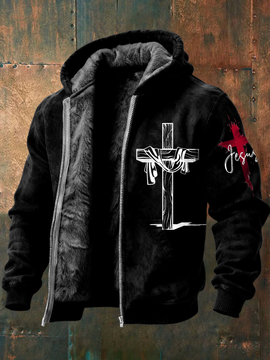 Retro jézus kereszt gyapjú-bélelt csuklyás kabát